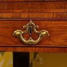 Having good proportions and wonderful deep color and patination. The crotch-grain top with a moulded edge and re-entrant corners, above a writing slide and four graduated drawers, retaining the original bracket feet. Handles replaced. English c.1750