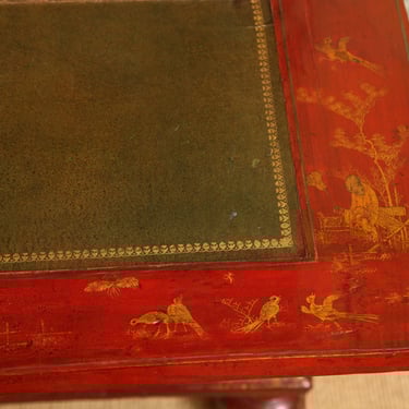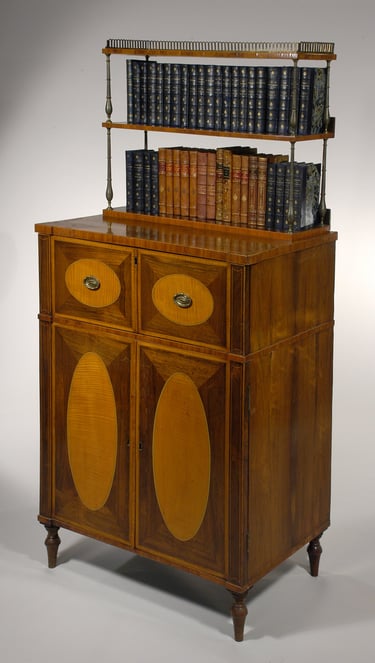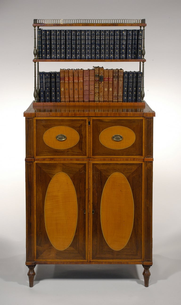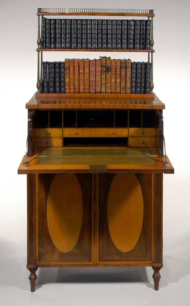 Having a two tier super structure with 3/4 pierced brass gallery supported on turned brass columns. Below is a hinged sliding drawer enclosing an arrangement of five figured satinwood drawers with cubbyholes above and an inset green leather writing surface, the lower pair of oval inlaid and painted cupboard doors enclosing an adjustable shelf, on four turned toupie feet. English circa 1800