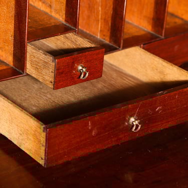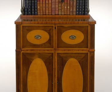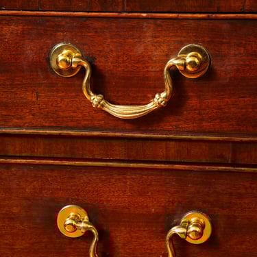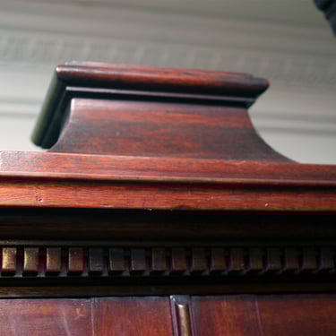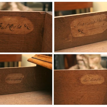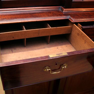 This bespoke piece was ordered for the owner of Walton Hall who was a ship's captain. It features pull out loper supports and hinges specially designed to enable the fall front to be opened to either a horizontal position or slanted down at an angle so the user could write standing up as was done at sea. Four drawers retain the original labels "Shaving Things," "Waistcoats," "Waistcoats" and "Old Coats, Etc.".