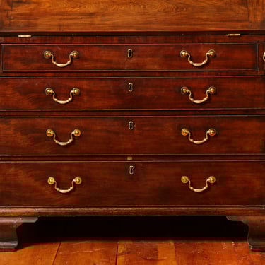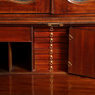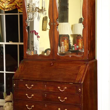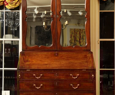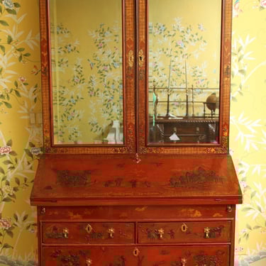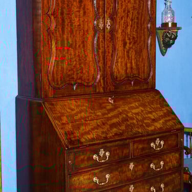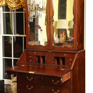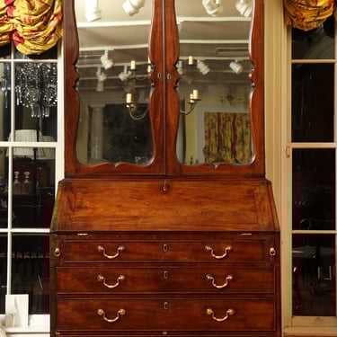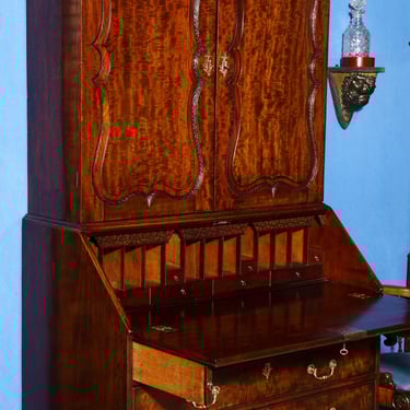 Attributed to Giles Grendey, having a broken pediment with dentils above two cartouche shaped original mirror doors enclosing an adjustable shelf, 9 arcaded cubby holes and four short drawers, above a slant-front fitted desk section having an arrangement of six short drawers and four cubby holes centered by a cartouche carved prospect door enclosing eight small drawers, above four graduated cockbeaded drawers with cast and chased gilt-brass handles and backplates, on the original shaped ogee bracket feet. English circa 1740.