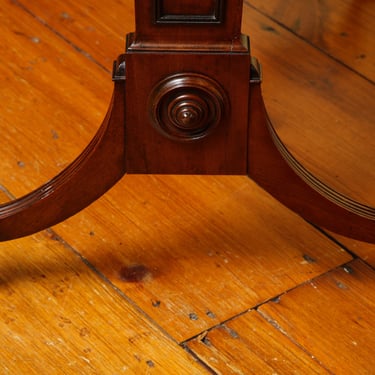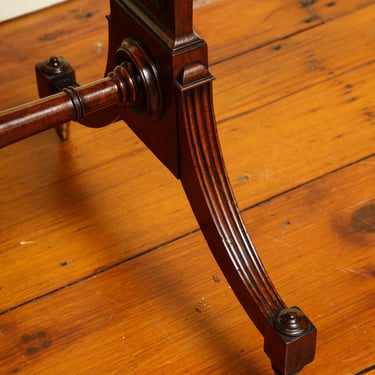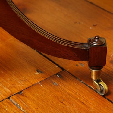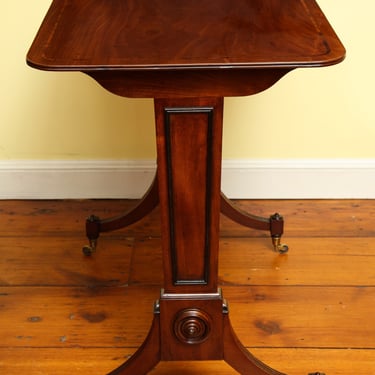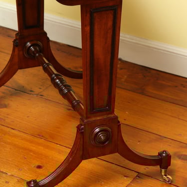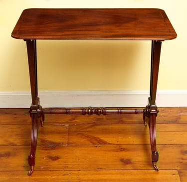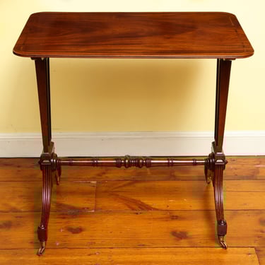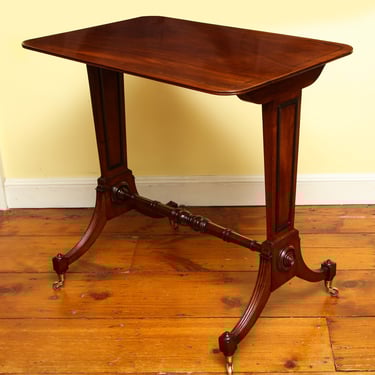The figured and reeded rectangular top with rounded corners and fine rosewood crossbanding on twin tapering trestle supports having applied ebony mouldings above a ring-turned stretcher and applied roundels on reeded splayed legs ending in block feet with brass castors. English circa 1800