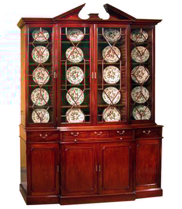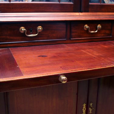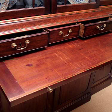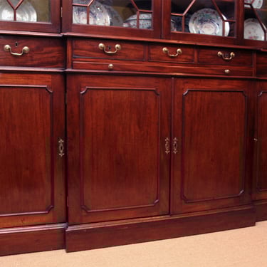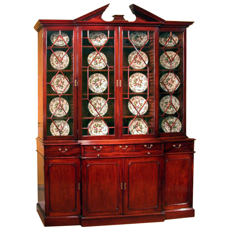 Having a swan’s neck architectural broken pediment with central moulded plinth and a dentil carved cornice, above four glazed diamond mullioned doors each enclosing four adjustable shelves; the lower section having a projecting thumb moulded overhang above five short drawers and a central writing slide, above four panelled doors with applied astragal mouldings enclosing adjustable shelves, on a plinth base. English circa 1760