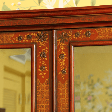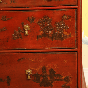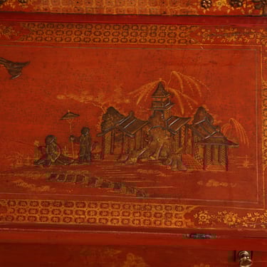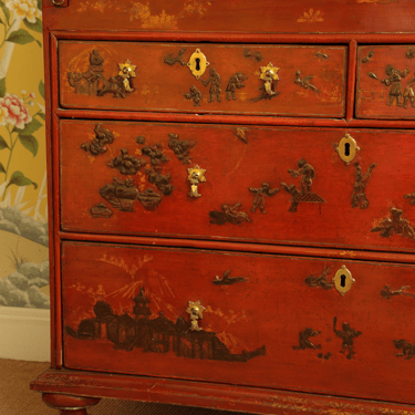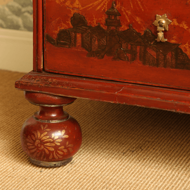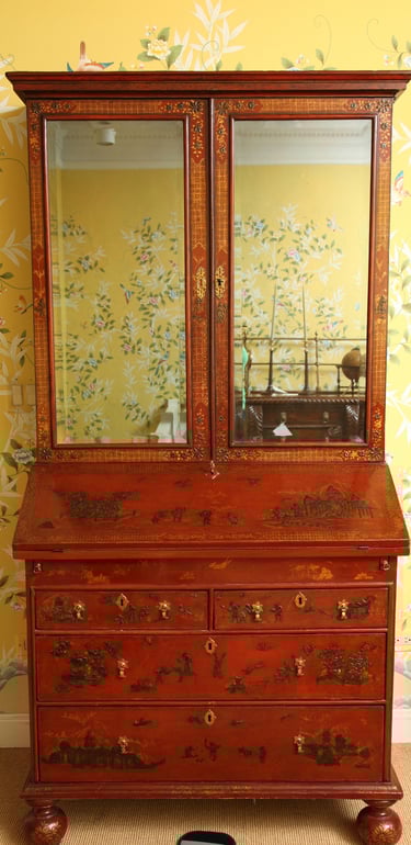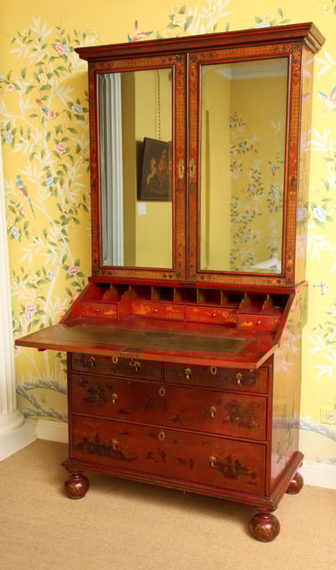 With moulded cornice above two mirror glazed doors enclosing shelves, decorated in gold with birds, foliage and diaper pattern, the projecting bureau with sloping hinged flap enclosing pigeon holes, four drawers and a well, decorated in raised gilt with figures and houses in a landscape, the base with three graduated drawers and sides similarly decorated, on turned bun feet. English circa 1700.