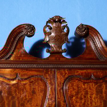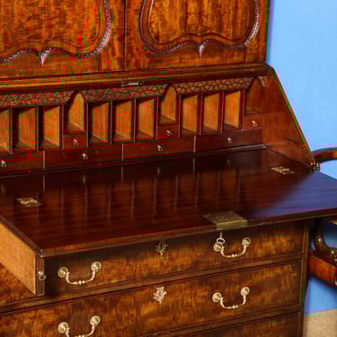 Attributed to Giles Grendey, the upper section with dentil molded swan's neck pediment with bold flowerhead terminals centering the original scrolled pierced and leaf-carved punchwork cartouche, the molded cornice above a pair of shaped fielded panel doors with leaf tip carved edges and a fall front opening to a writing surface and an interior fitted with blind-fret carved valanced drawers forming arches above cubby holes and small and large drawers, with two short and three long graduated cockbeaded drawers below, raised on ogee bracket feet. English circa 1740.