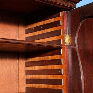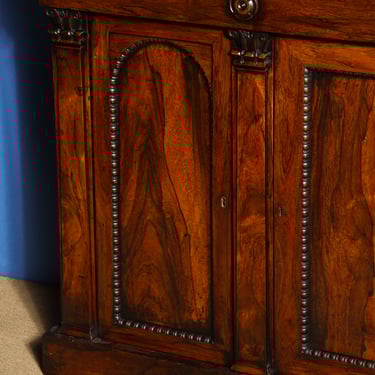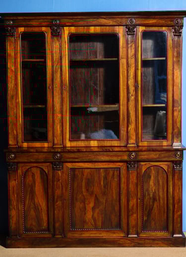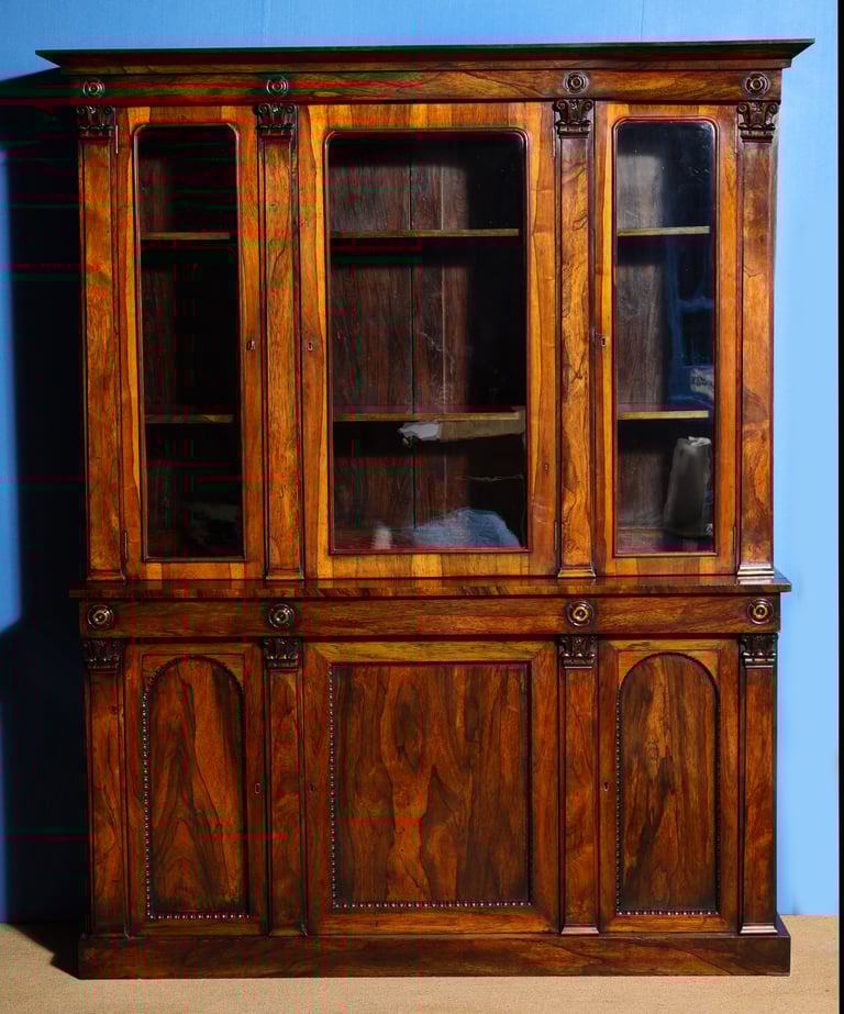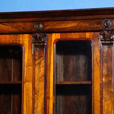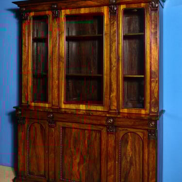 The projecting cornice above a plain frieze with finely carved applied flower-heads. The upper section with three highly figured book-matched glazed doors opening to a faux rosewood interior and six adjustable bookshelves with rosewood fronts. Each door is flanked by tapered pilasters with flower and volute carved capitals; the lower section with three paneled doors with bead and reel moldings flanked by pilasters, enclosing six adjustable shelves, on a plinth base. English circa 1830.