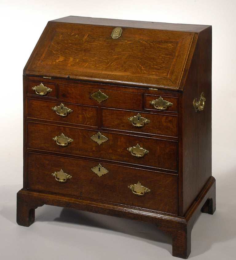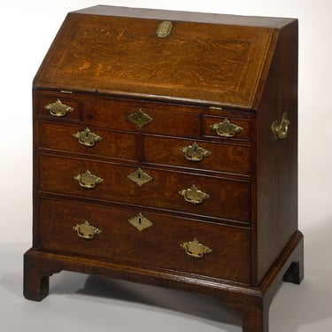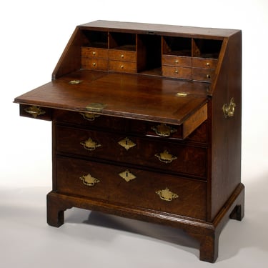 The hinged lid opening to reveal a writing surface and fitted interior with pigeon holes, small drawers and a sliding panel opening to a well, above four short and two long graduated drawers on original bracket feet with original brasses., English c. 1740