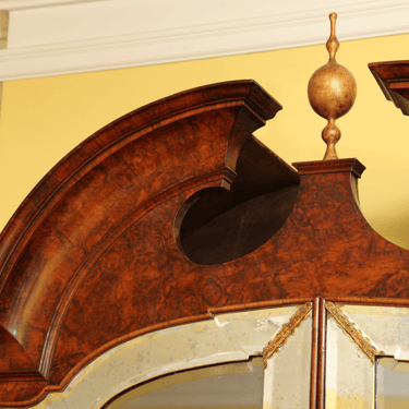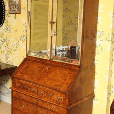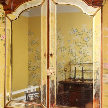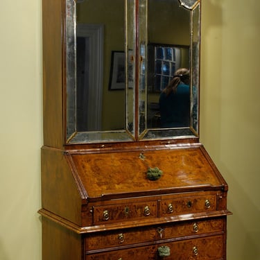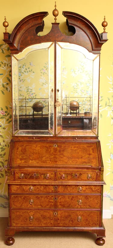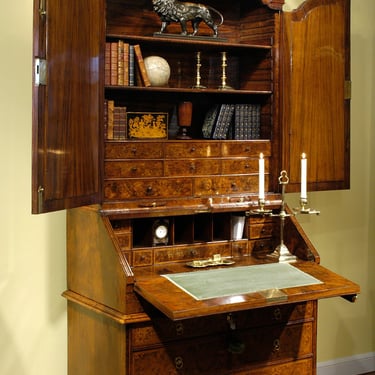 The top having a double domed and molded broken arched pediment with three turned gilt finials above a pair of shaped arched bevelled mirror doors with applied twice bevelled border glasses in walnut frames, and gilt and penwork arabesque corner hasps and applied gilt and penwork key escutcheons. The doors which are backed by figured walnut panels open to adjustable shelves above an arrangement of eight figured drawers and two pull-out candle slides. The slant front desk section has twin book-matched burl walnut veneers with feather banding and crossbanding and a double moulded frame enclosing an arrangement of nine drawers and six cubby holes above two short drawers; the lower section with three long graduated drawers on ball and bracket feet. Retaining the original brasses, locks, keys and paper drawer labels. English circa 1720 Provenance: Made for and acquired from Walton Hall, Derbyshire