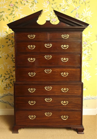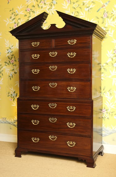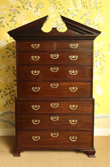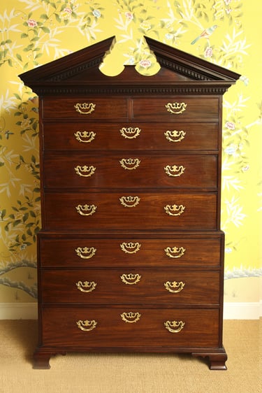 Very Fine Diminutive Chippendale Period Mahogany Chest on Chest, the top section having a broken architectural pediment with two rows of applied carved dentils, above two short and three long graduated cockbeaded drawers, the lower section with three long graduated cockbeaded drawers, on shaped ogee bracket feet, retaining the original locks and handles. English circa 1760