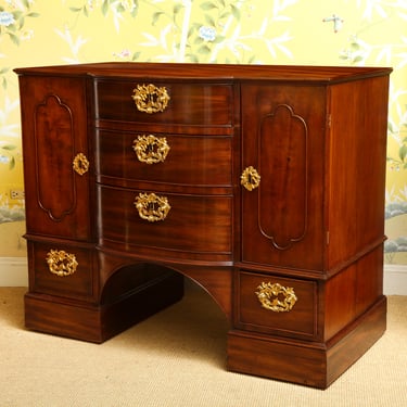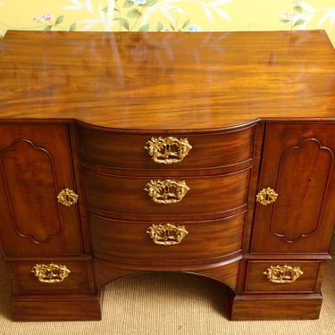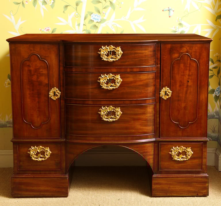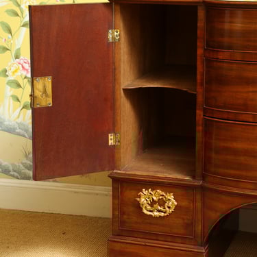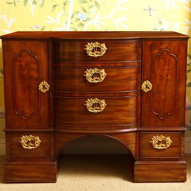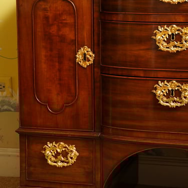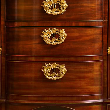 Very Fine George III Ormolu Mounted Mahogany Commode, having a moulded rectangular bowed center above three graduated cockbeaded drawers above the arched center & flanked on either side by a shaped paneled door and short drawer mounted with gilt bronze rococo handles cast with foliage and cabochons, on plinth bases. Attributed to the cabinetmakers Wright & Elwick. English circa 1760.