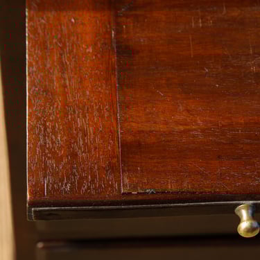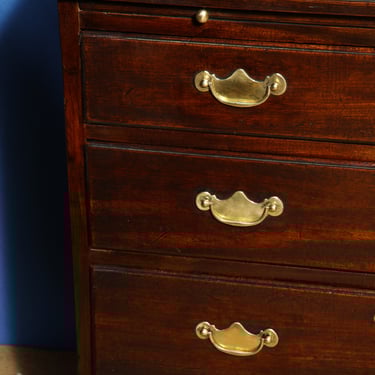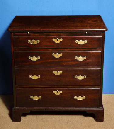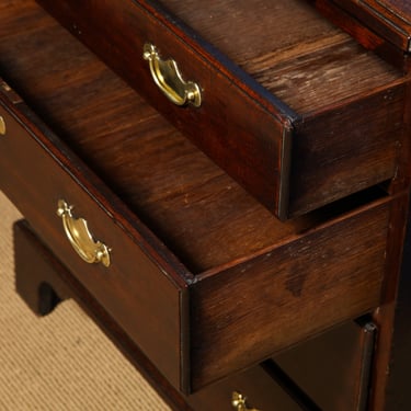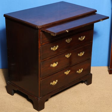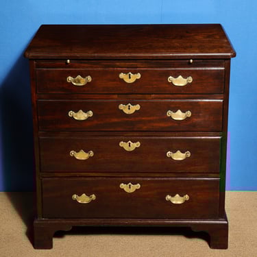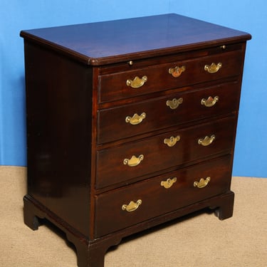 Having good proportions and wonderful deep color and patination. The crotch-grain top with a moulded edge and re-entrant corners, above a writing slide and four graduated drawers, retaining the original bracket feet. Handles replaced. English c.1750