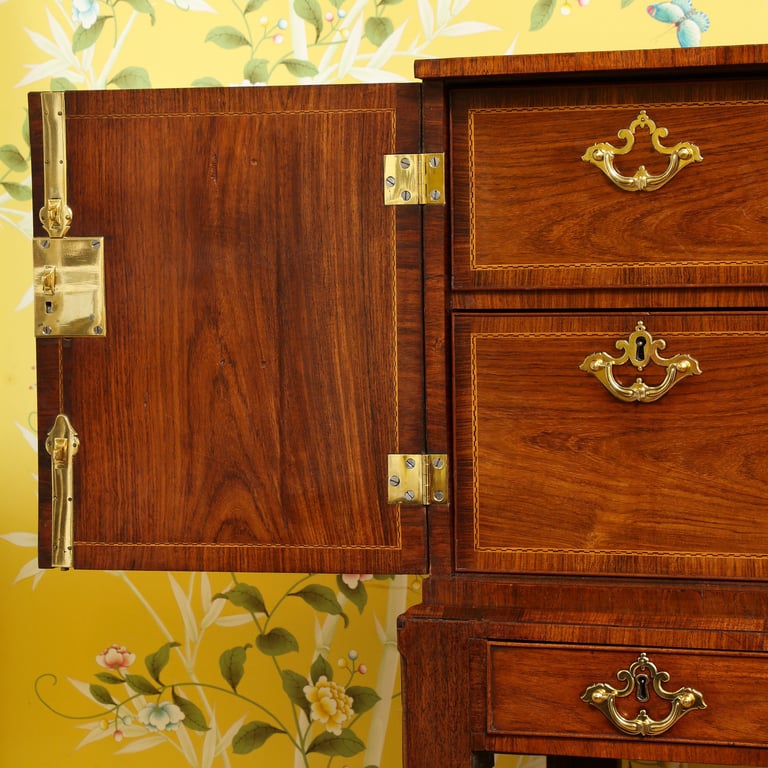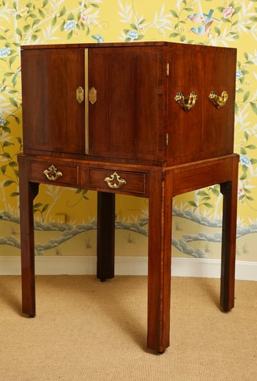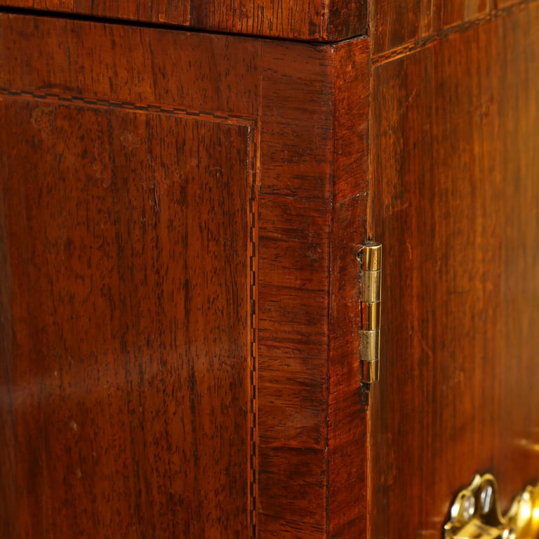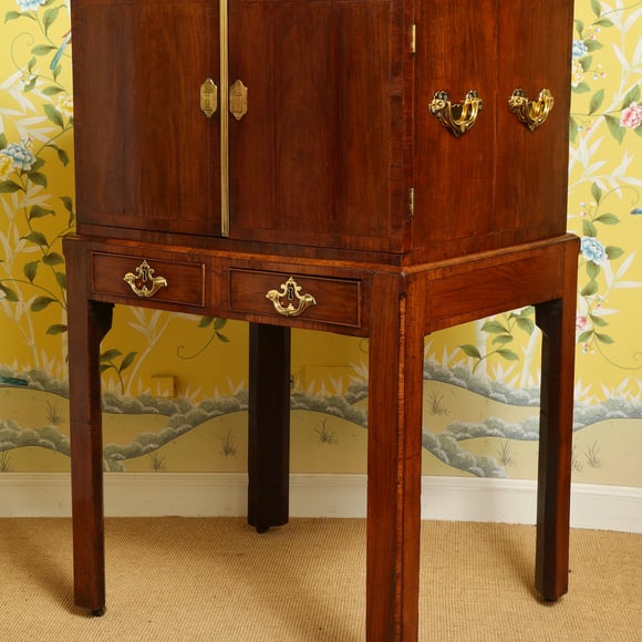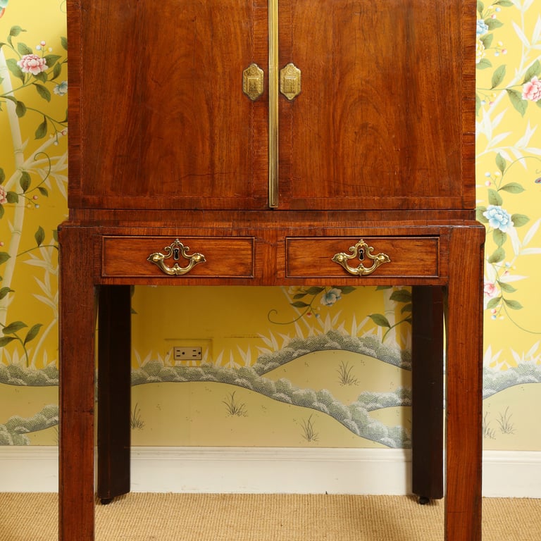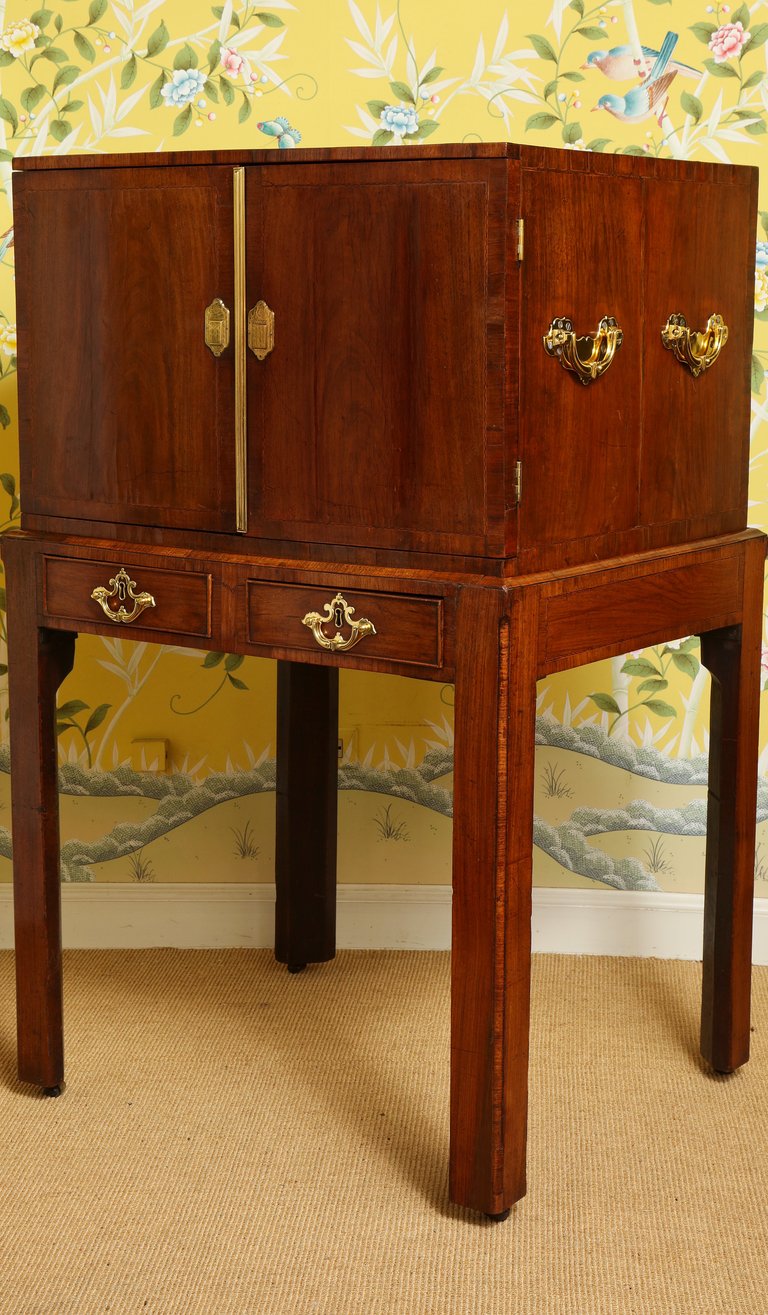 The cabinet finished on all four sides with finely book-matched veneers inlaid with checkering and rosewood cross-banding. The cabinet with a pair of cross-banded doors veneered on both sides enclosing one long over two short fitted drawers, and having twin shaped original brass carrying handles to either side matching the interior handles. The stand having square chamfered legs with two short drawers and original cast handles and backplates to match, on brass and leather castors. English circa 1740