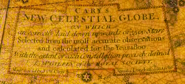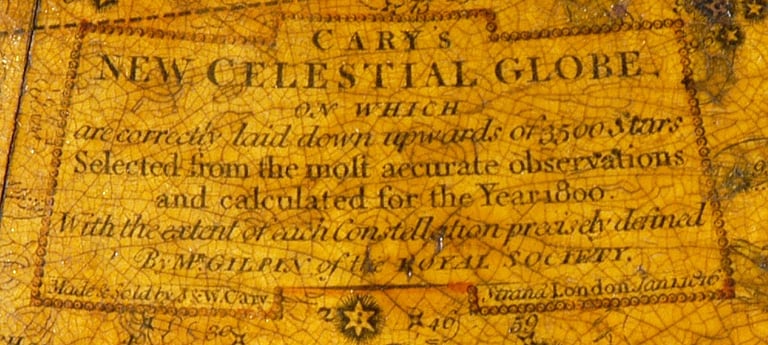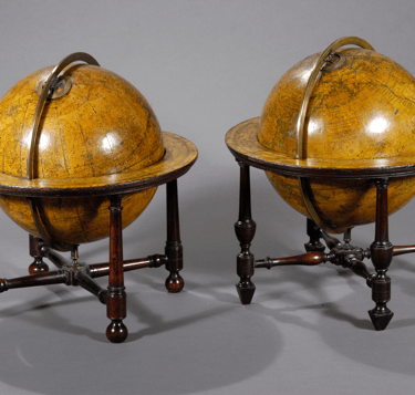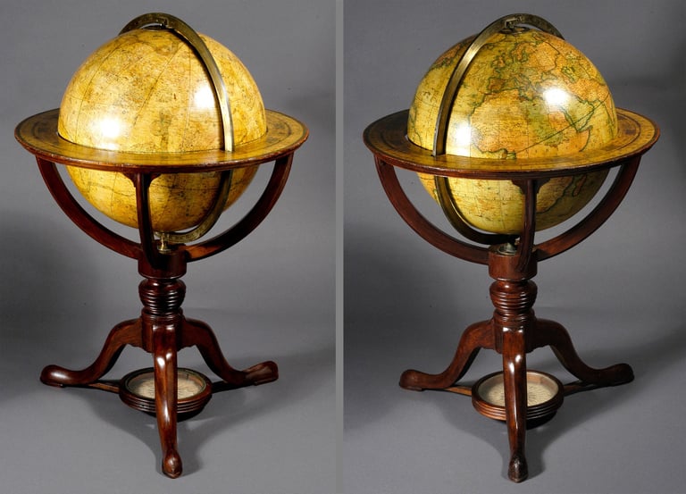 Fine Pair of Table Globes by Cary of London, each having a vertical brass engraved meridian ring held perpendicular to a horizontal wooden ring applied with zodiac scales, labled “Made & Sold by G. & J. Cary, 86, St. James’s Street, London, March 15, 1821” The Celestial “J. & W. Cary, Strand, January 11, 1816.”