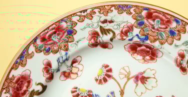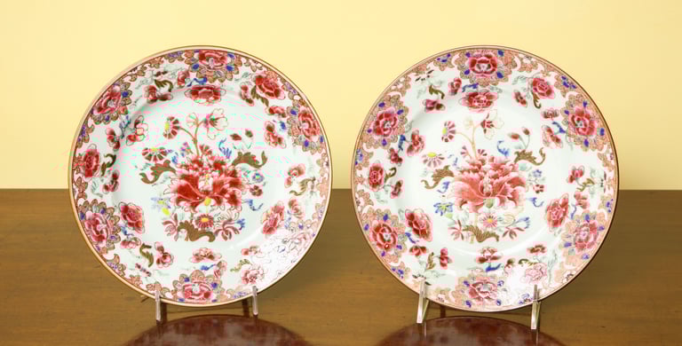 Fine Set of Twelve Chinese Export Enameled Porcelain Famille Rose Plates, each with a central peony with sprays of foliage and flowers in pinks, red, yellow, blue, green and turquoise on an undulating cafe-au-lait border. Chinese circa 1750