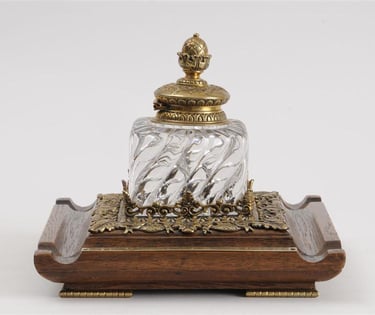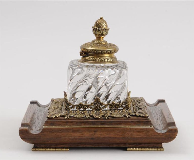Having a large Baccarat type crystal inkwell with hinged sunburst lid and pinecone finial, bearing a bronze plaque with the engraved inscription "Presented to H.A.L. Vernon, Esq. on Attaining His 21st Birthday Sep 3rd, 1889 By the Servants of Hilton Park". French circa 1889