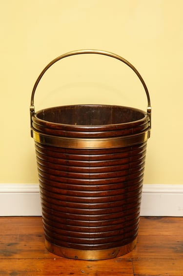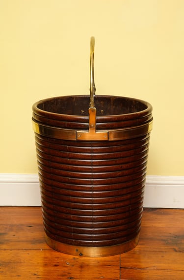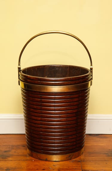 Large Irish Georgian Brass Banded Mahogany Peat Bucket, of dense Cuban mahogany, the ribbed tapering body with reeded brass upper and lower collars and finely wrought hinged brass shaped hoop handle with heavy T-form brass fittings, circa 1790-1800