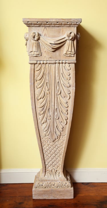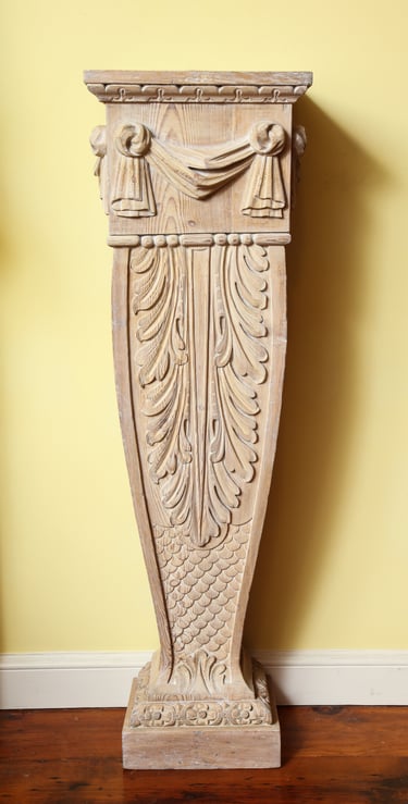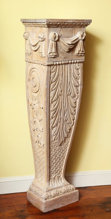 William Kent Period Carved Pine Pedestal with a rectangular top above a top register with applied drapery carving to front and sides; the front carved with large pendant acanthus leaf above fish scales, each side with scroll and trailing bell flowers above fish scales, on a rectangular plinth with ribbon and flower head carving. English circa 1740
